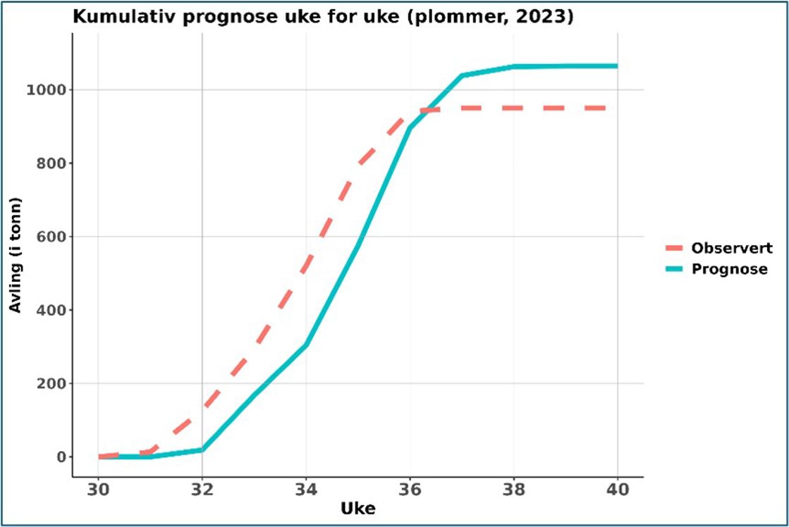 Prosjektet er inne i sitt andre år. Resultata viser at prognosane traff ganske godt i fjor (Figur 1). Etter som våren i år var veldig varm, viste dei første prognosane at avlinga ville bli litt låge. Etter kvart som mai og juni også vart varme månadar, auka avlingsprognosane mykje. Per i dag ser det ut som at modellen vil treffe relativt bra.