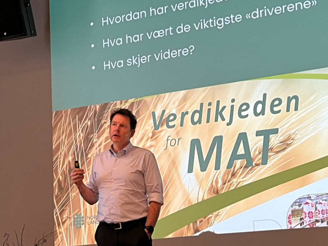 Administrerende direktør Gaute Lenvik fra Norsk Landbrukssamvirke holdt innlegg om Verdikjeden for mat. I innlegget sitt fortalte han om hvordan verdikjeden for mat har utviklet seg de siste 30 årene, om hva som har vært de viktigste driverne og tanker for den videre utviklingen.