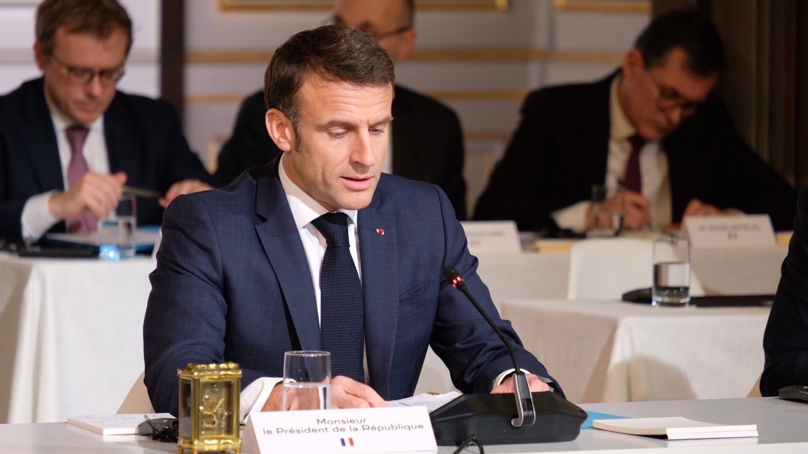 "Frankrikes president sitter ved et konferansebord.