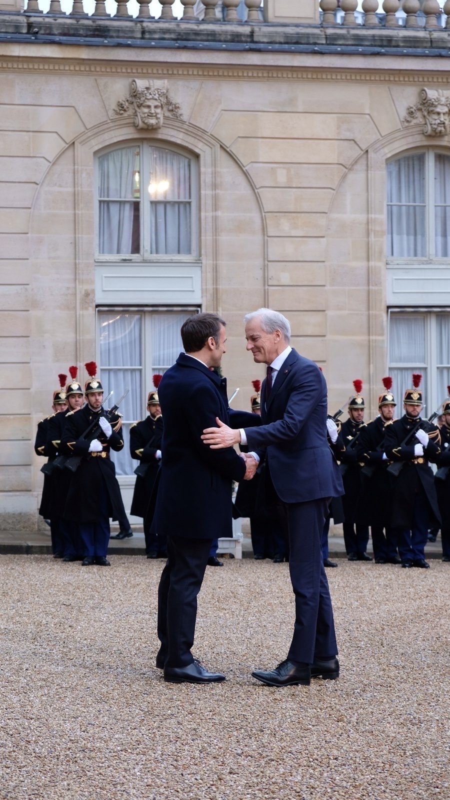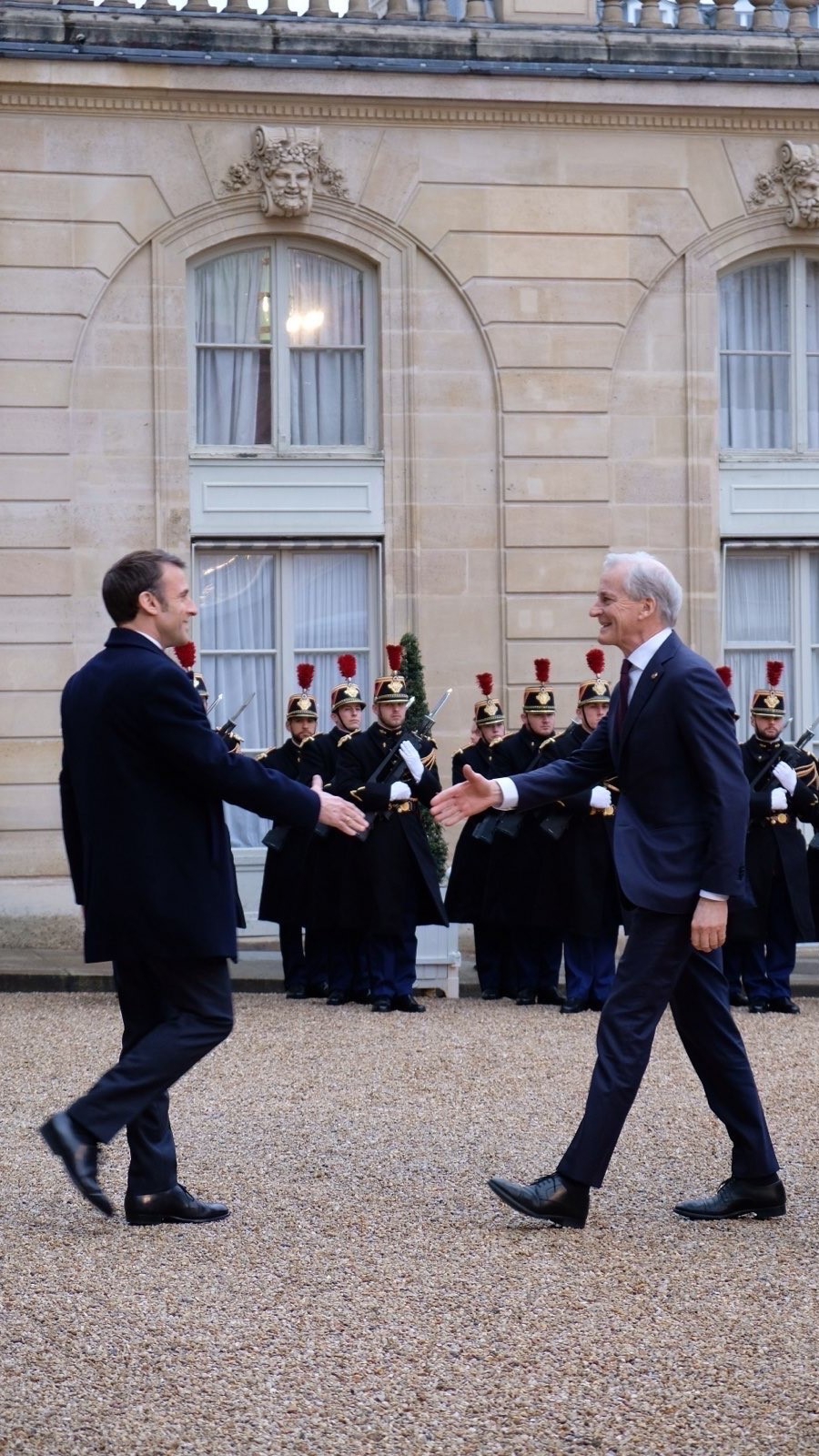 "Macron og Støre går mot hverandre med hendene utstrakt - hilser snart på hverandre.