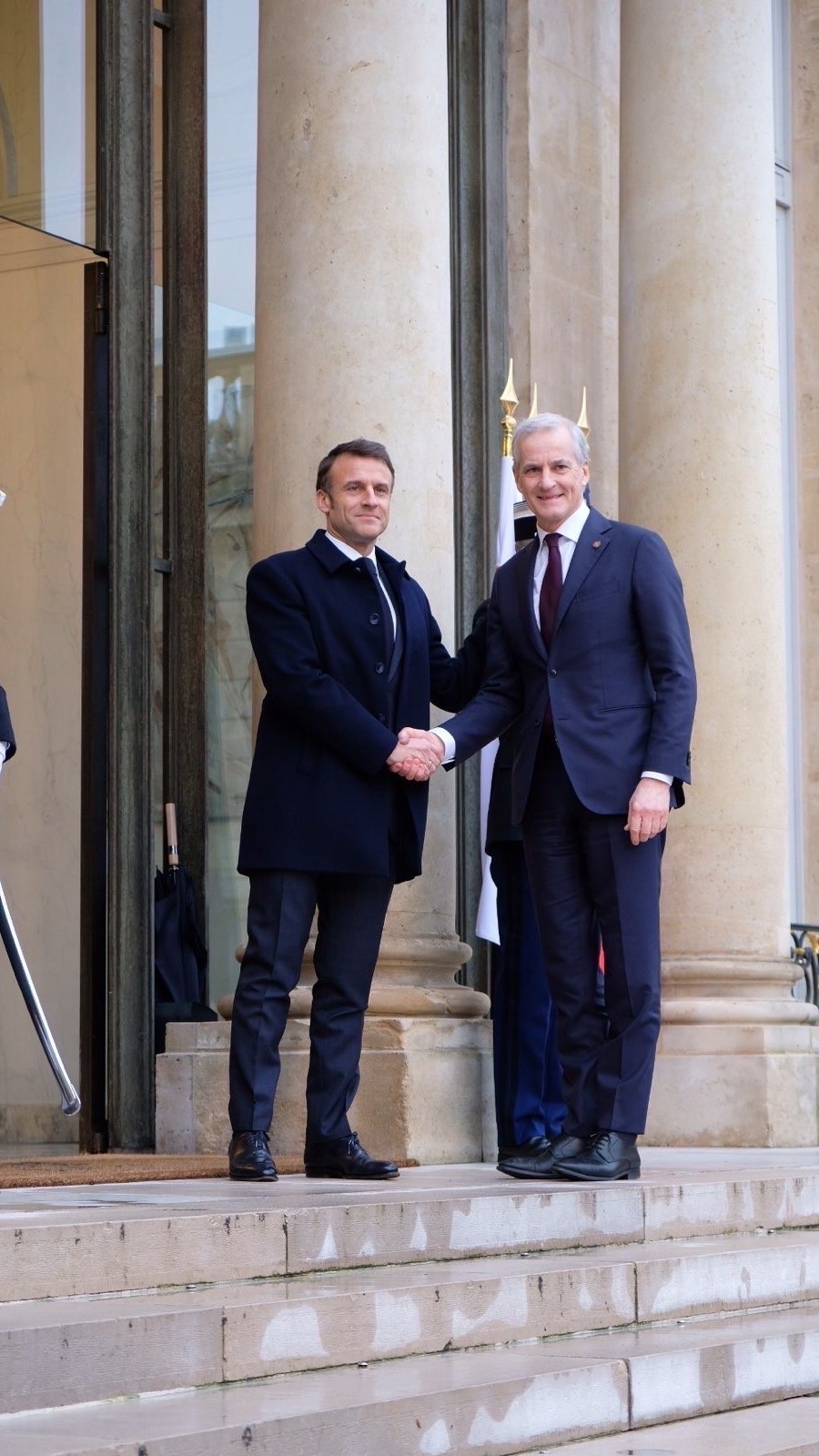 "Macron og Støre står sammen på toppen av en trapp i Elysée-palasset i Paris.