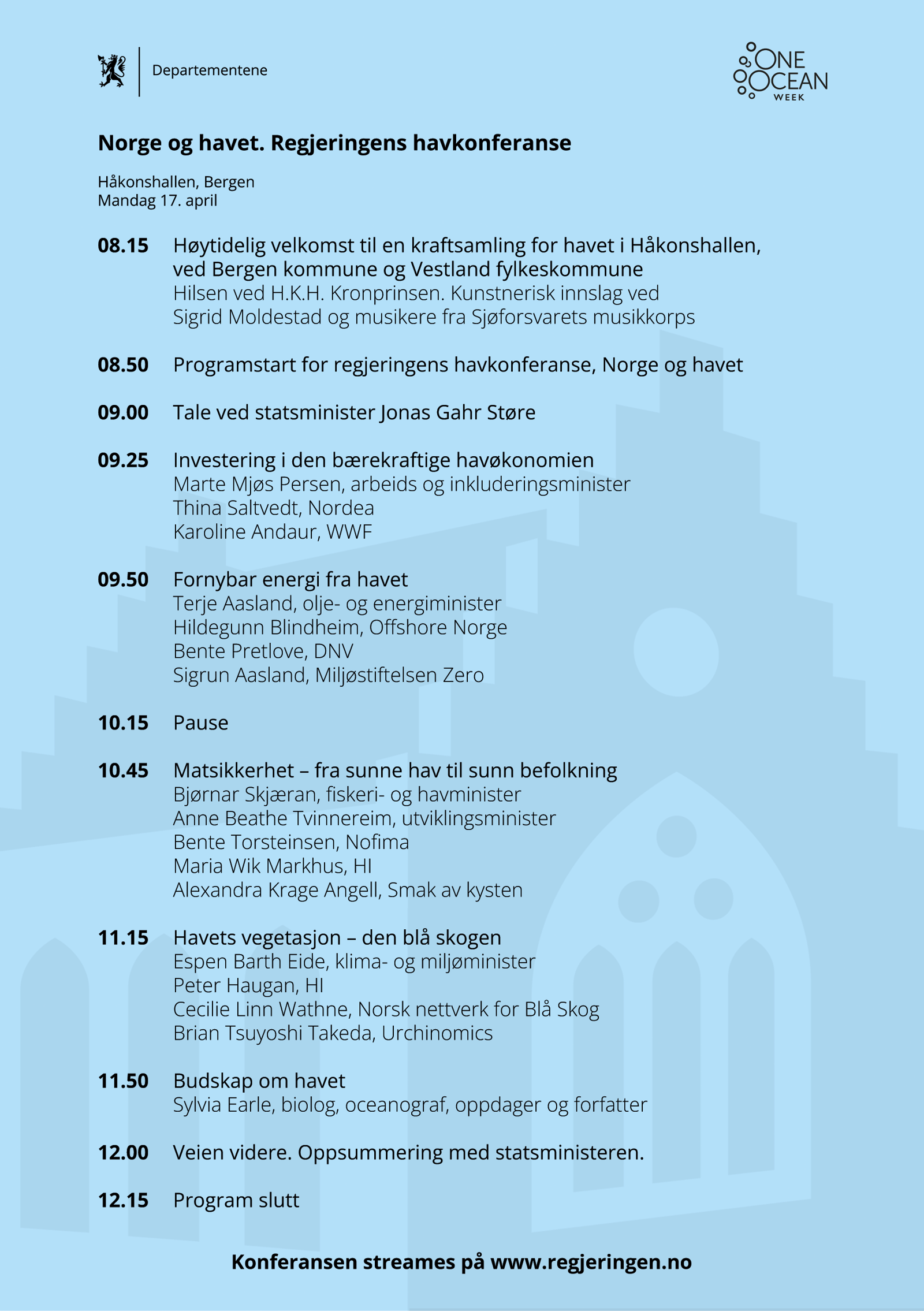 Statsministeren deltar på konferansen i Bergen sammen med klima- og miljøminister Espen Barth Eide, olje- og energiminister Terje Aasland, fiskeri- og havminister Bjørnar Skjæran, arbeids- og inkluderingsminister Marte Mjøs Persen og utviklingsminister Anne Beathe Tvinnereim. I tillegg deltar en rekke eksperter fra organisasjoner, næringslivet og forskning.