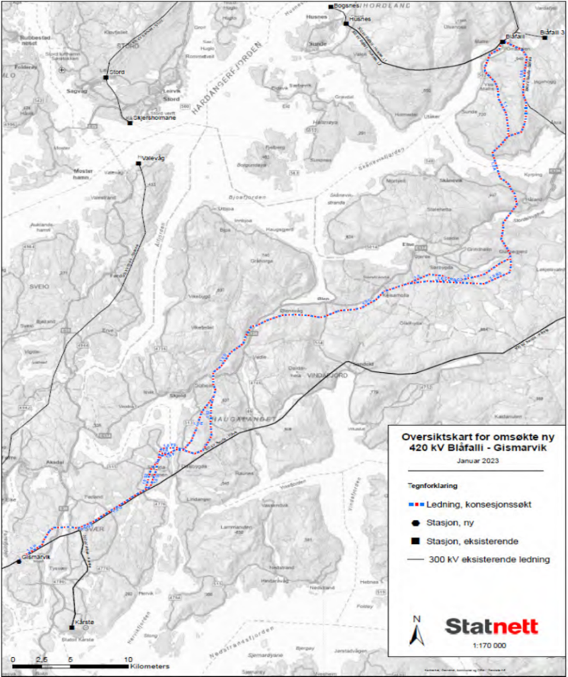 Statnett har i dag fått konsesjon til en ny kraftledning på 420 kilovolt (kV) fra Blåfalli koblingsstasjon i Kvinnherad kommune til ny Gismarvik transformatorstasjon i Tysvær kommune. Traséen går via Etne og Vindafjord kommuner.
