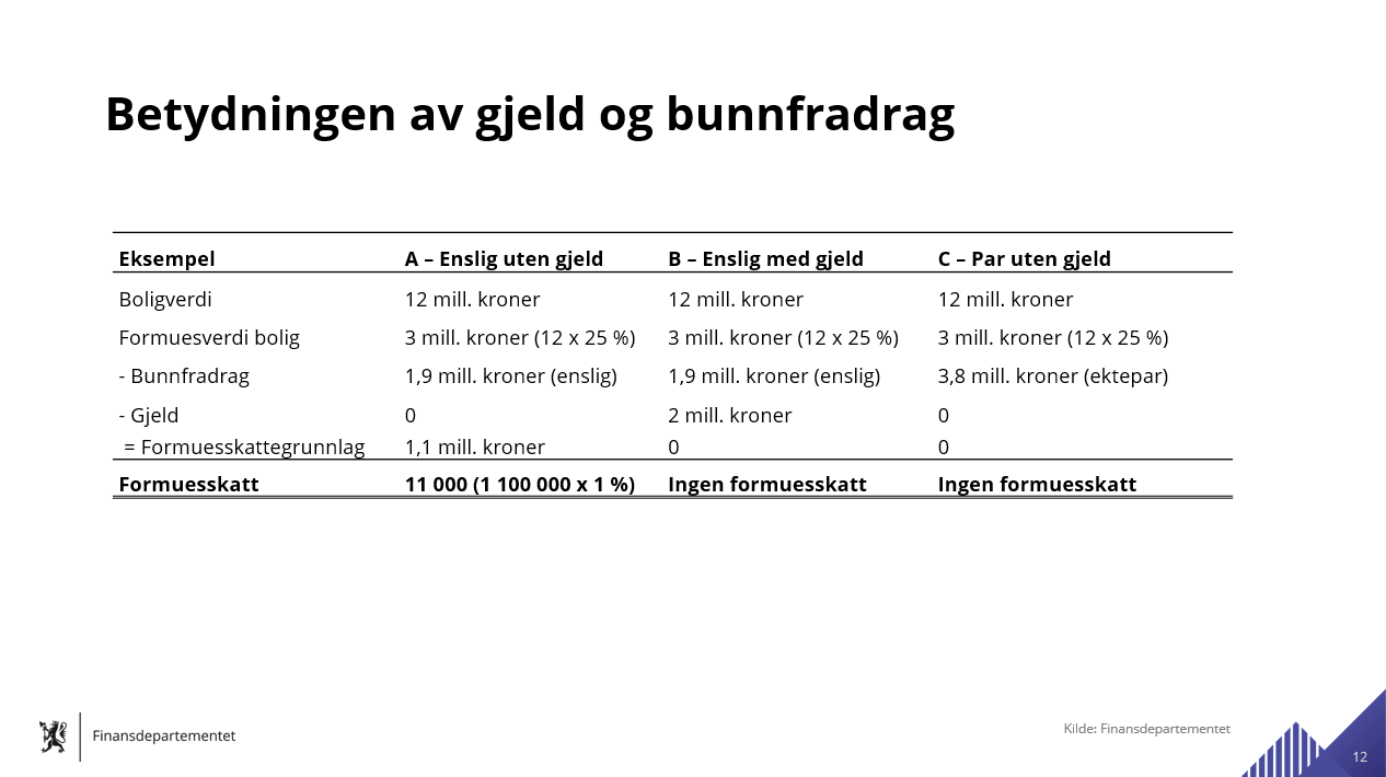 Dette illustrerer at man må ha lite eller ingen gjeld, eller ha bolig med høy verdi for å betale formuesskatt av primærboligen.