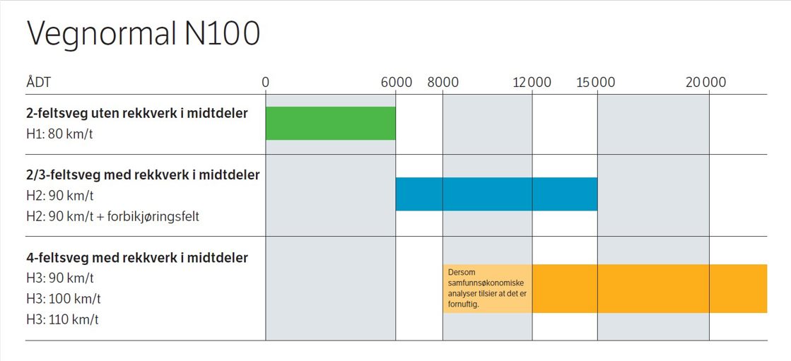 - Veinormalklasse H2 (to/trefeltsvei med midtdeler og forbikjøringsfelt), det vil si dagens standard/dimensjonering for veier med ÅDT 6 000-12 000 biler, endres slik at den kan benyttes opp til ÅDT 15 000. ÅDT-intervallet for veinormalklasse H2 (to/trefeltsvei) fastsettes dermed til 6 000-15 000.