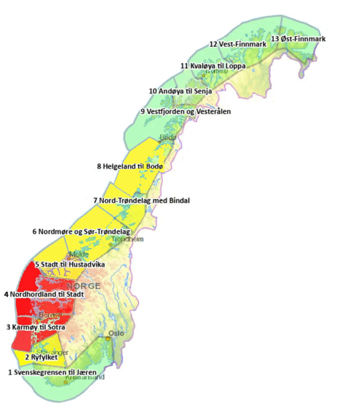 - Fem produksjonsområder får gult lys: Ryfylke (PO2), Stadt til Hustadvika (PO5), Nordmøre og Sør-Trøndelag (PO6), Nord-Trøndelag med Bindal (PO7) og Helgeland til Bodø (PO8). I disse områdene skjer det ingen endringer i produksjonskapasiteten.