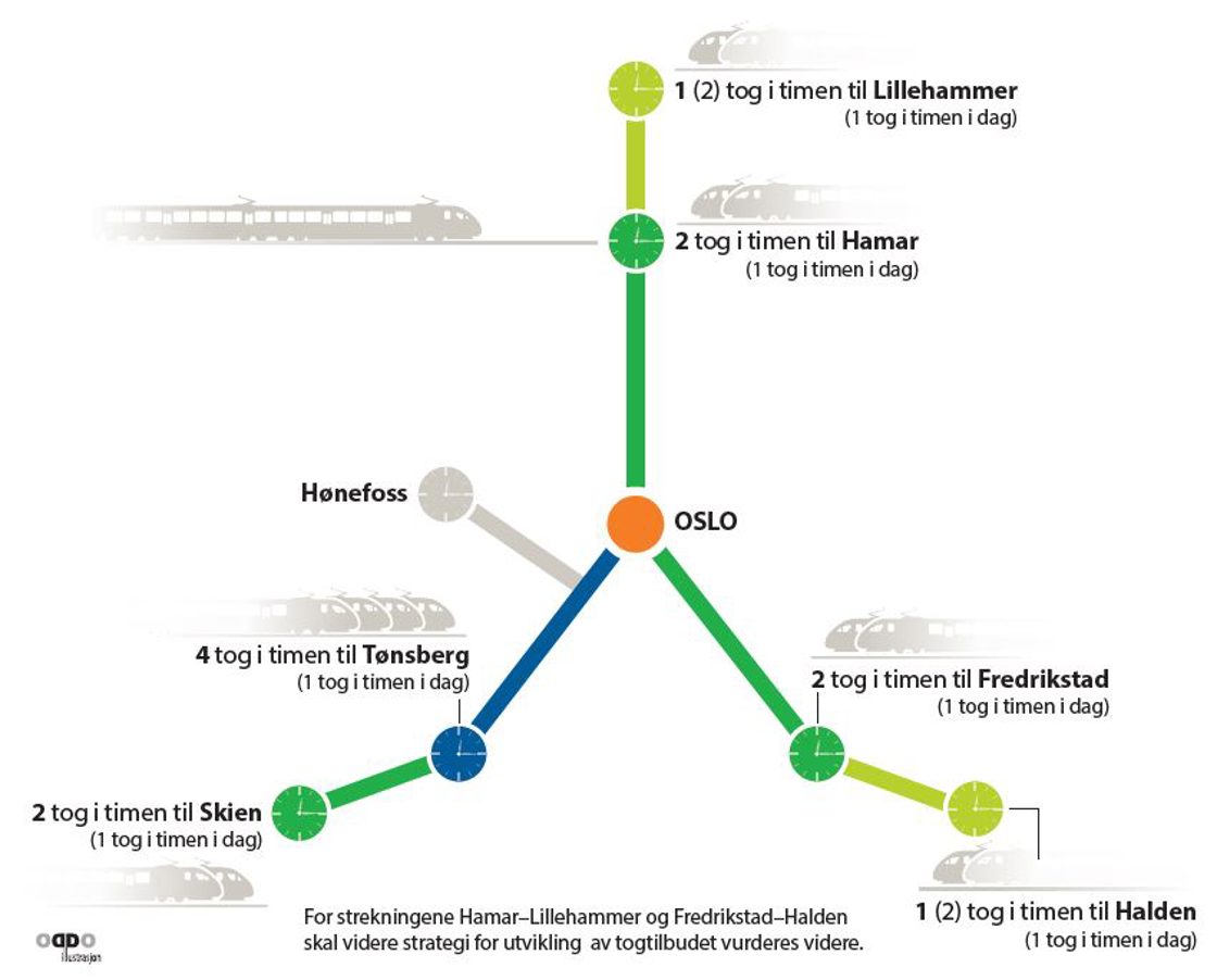 - Vestfoldbanen: Fire tog i timen i grunnrute mellom Oslo og Tønsberg og to tog i timen i grunnrute mellom Oslo og Skien