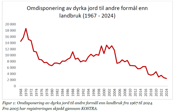 De endelig tallene fra kommunene (KOSTRA) viser at omdisponeringen av dyrket jord var på 2 499 dekar i 2024. Dette er det laveste tallet siden registreringen startet i 1967.