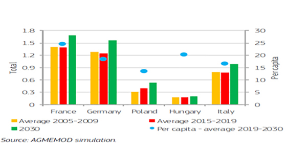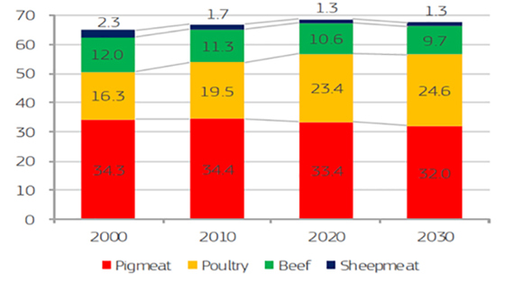 Det forventes at bærekraftig jordbruksproduksjon vil bli mer vektlagt i EU i 2030, sammenlignet med i dag. Dyrevelferdsregler vil også spille en rolle. Den samlede eksporten av levende dyr vil derfor bli redusert med 30 prosent i 2030. Antall storfe og svin vil bli redusert i EU, mens antall dyr i fjørfesektoren vil øke på grunn av økt innenlandsk konsum og eksport. Det forventes, basert på dagens politikk, at kjøttproduksjonen i EU vil bli redusert med samlet sett 2,3 prosent i 2030 sammenlignet med i dag.