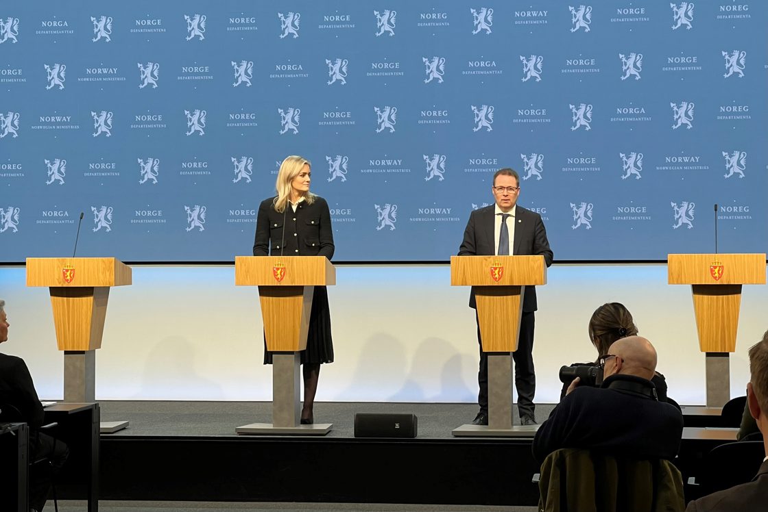Forsvarsminister Bjørn Arild Gram (Sp) og justis- og beredskapsminister Emilie Enger Mehl (Sp) innledet på pressekonferansen, før NK Etterretningstjenesten, Lars Nordrum, sjef Politiets sikkerhetstjeneste, Beate Gangås, og sjef Nasjonal sikkerhetsmyndighet, Sofie Nystrøm, la frem sine vurderinger rundt aktuelle sikkerhetsutfordringer.