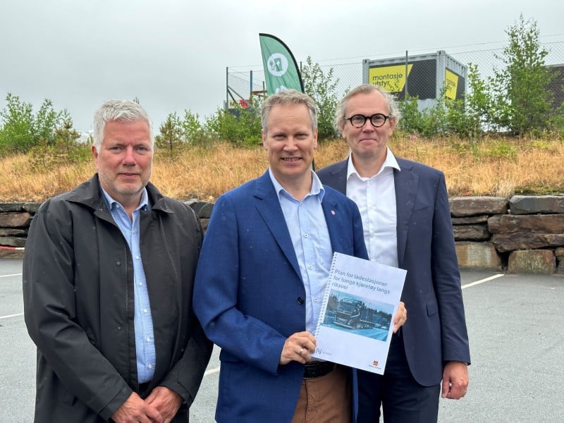 Samferdselsminister Jon-Ivar Nygård mottok planen for utbygging av ladestasjoner langs riksveinettet for tunge kjøretøy i Lillesand mandag fra Ove Myrvåg i Statens vegvesen (t.v.) og Finn Aasmund Hobbelstad i Nye Veier (t.h.). Foto: Edvard Andersen, Samferdselsdepartementet