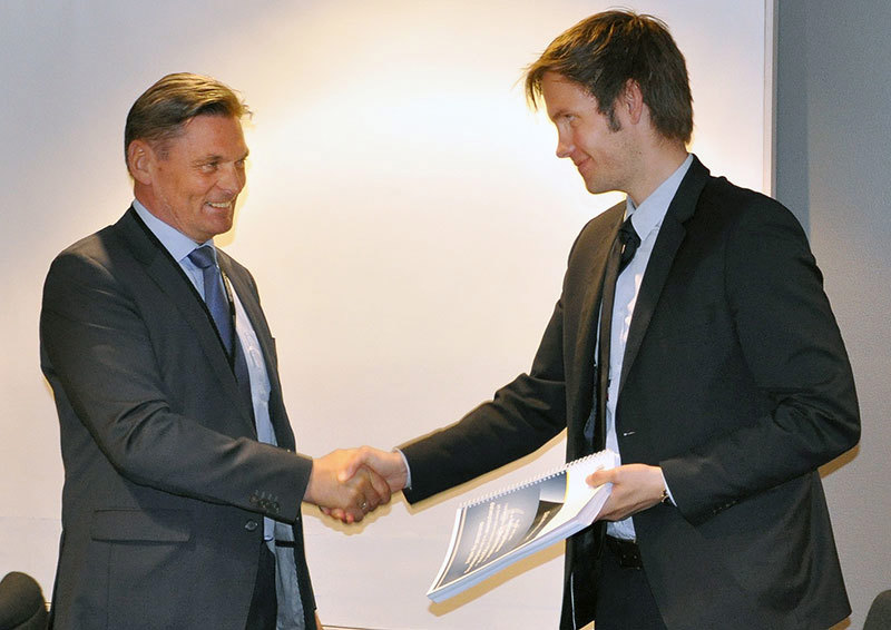 Avdelingsdirektør Knut Smedsrud i Politidirektoratet (tv.) overleverer Datakrimstrategien til statssekretær Vidar Brein-Karlsen. (Foto: Arne Røed Simonsen)