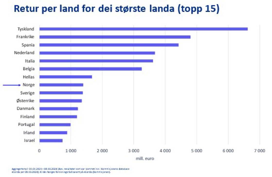 Horisont Europa har eit budsjett på rundt éin billion norske kroner i perioden 2021–2027. Ambisjonen er at norske deltakarar skal hente heim 2,8 prosent av pengane som vert lyste ut. Til no har norske aktørar konkurrert seg til nesten 15 milliardar kroner, eller 3,31 prosent. Noreg ligg med det òg føre dei andre nordiske landa.