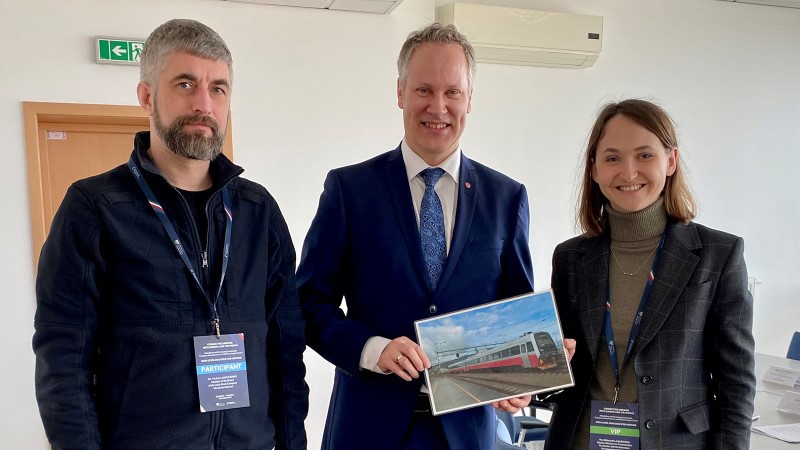 Samferdselsminister Jon-Ivar Nygård sammen med Ukrainas vise-infrastukturminister Oleksandra Azarkhina og styreleder i Ukranian Railways, Yevhen Liashchenko. Med seg til møtet har Nygård et bilde av togtypen Norge donerer til Ukraina. Foto: Susanne Stephansen, Samferdselsdepartementet