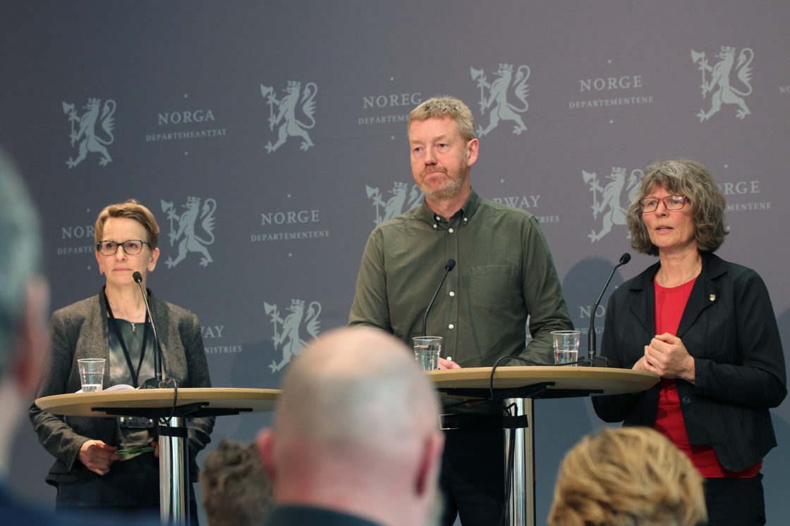 Statens forhandlingsleder, ekspedisjonssjef Viil Søyland, Bjørn Gimming, leder i Norges Bondelag og Kjersti Hoff, leder i Norsk Bonde- og Småbrukarlag. Foto: Landbruks- og matdepartementet