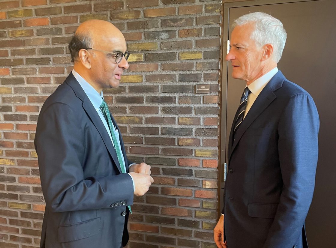 Statsminister Støre møtte i dag Singapores Senior Minister Tharman Shanmugaratnam på statsministerens kontor. De to drøftet den geopolitiske situasjonen og ulike internasjonale initiativ om pandemiberedskap, energi, vann og viktigheten av det multilaterale systemet.