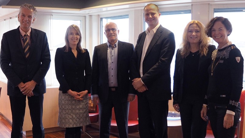 Styret for det nye Jernbaneinfrastrukturforetaket: Fra venstre: Auke Lont, Ane Breivega, Olaf Melbø, samferdselsminister Ketil Solvik-Olsen, Toril Nag og Siri Hatlen (leder).