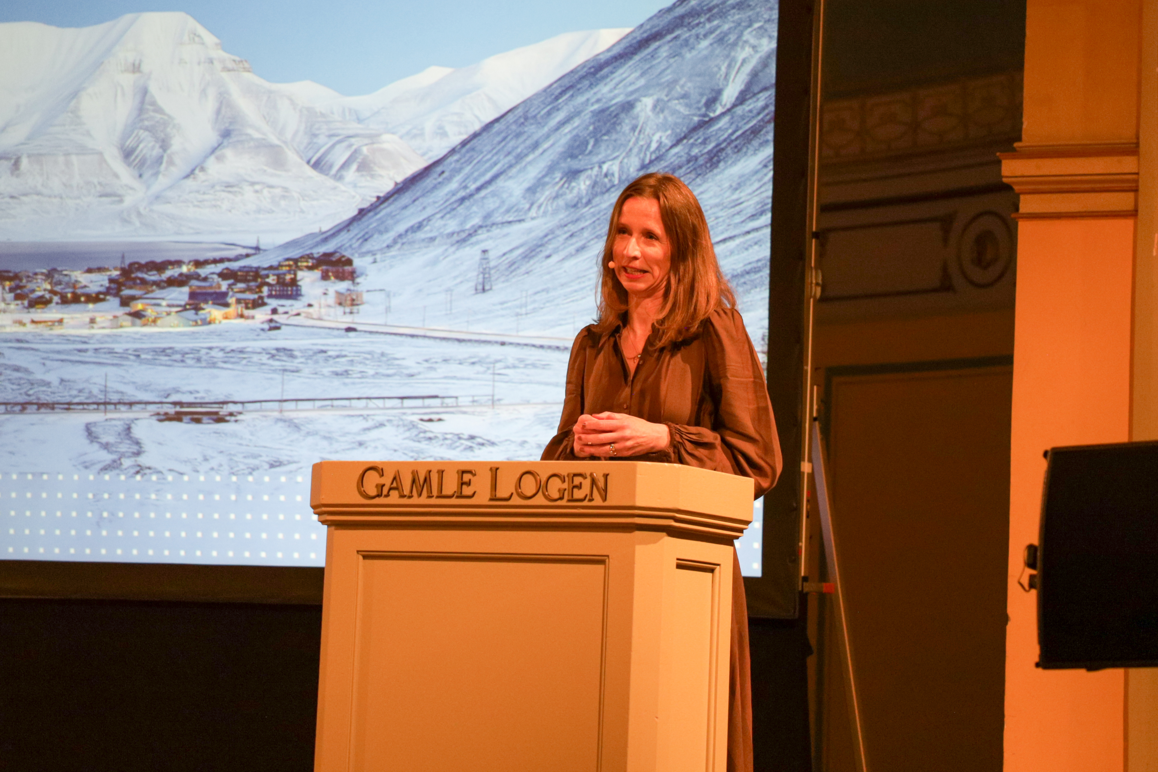 Svalbardminister og justis- og beredskapsminister Astri Aas-Hansen var vert for arrangementet i Gamle Logen i Oslo, der kongeparet, kronprinsparet og statsministeren også var til stede.