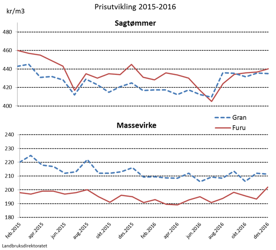 Massevirkeprisene fortsatte å synke noe gjennom hele 2016, en trend som startet allerede i 2013. I desember endte massevirkeprisen på gran 211 kr/m3 og furu 202 kr/m3, det høyeste nivå siden sommeren 2015.