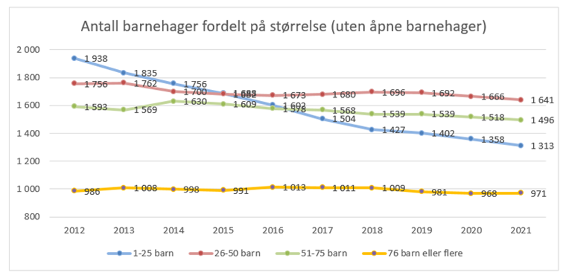 I dag er det 5 500 barnehager i landet. De nye tallene viser at det blir stadig færre barnehager. Det er først og fremst blitt færre av de minste barnehagene med 25 barn eller færre. Andelen små barnehager har gått ned fra 31 prosent i 2012 til 24 prosent i dag (se figur).