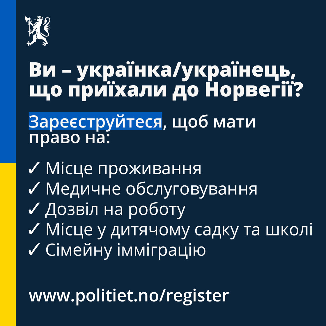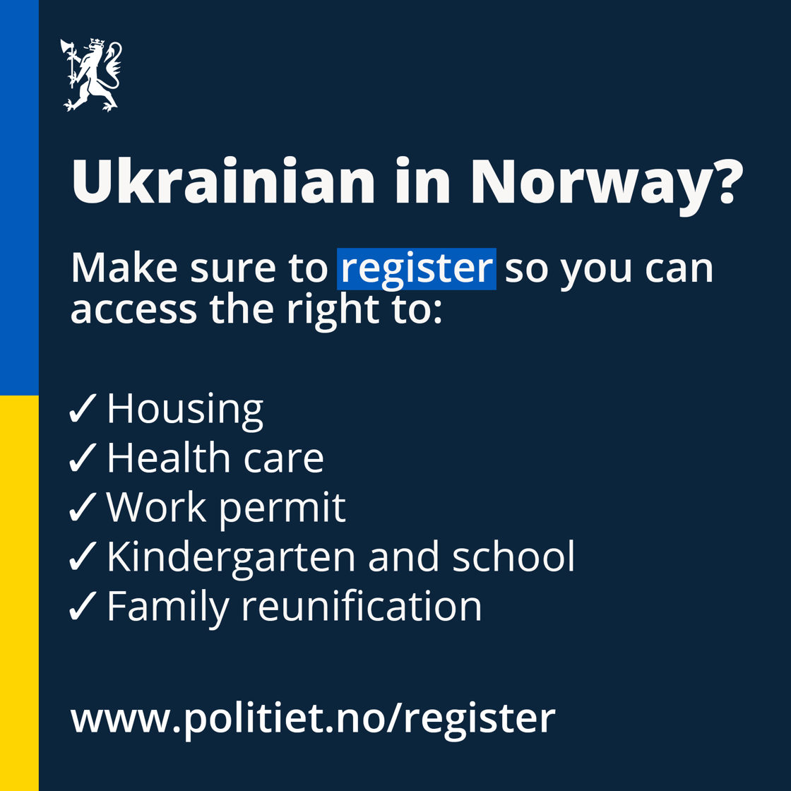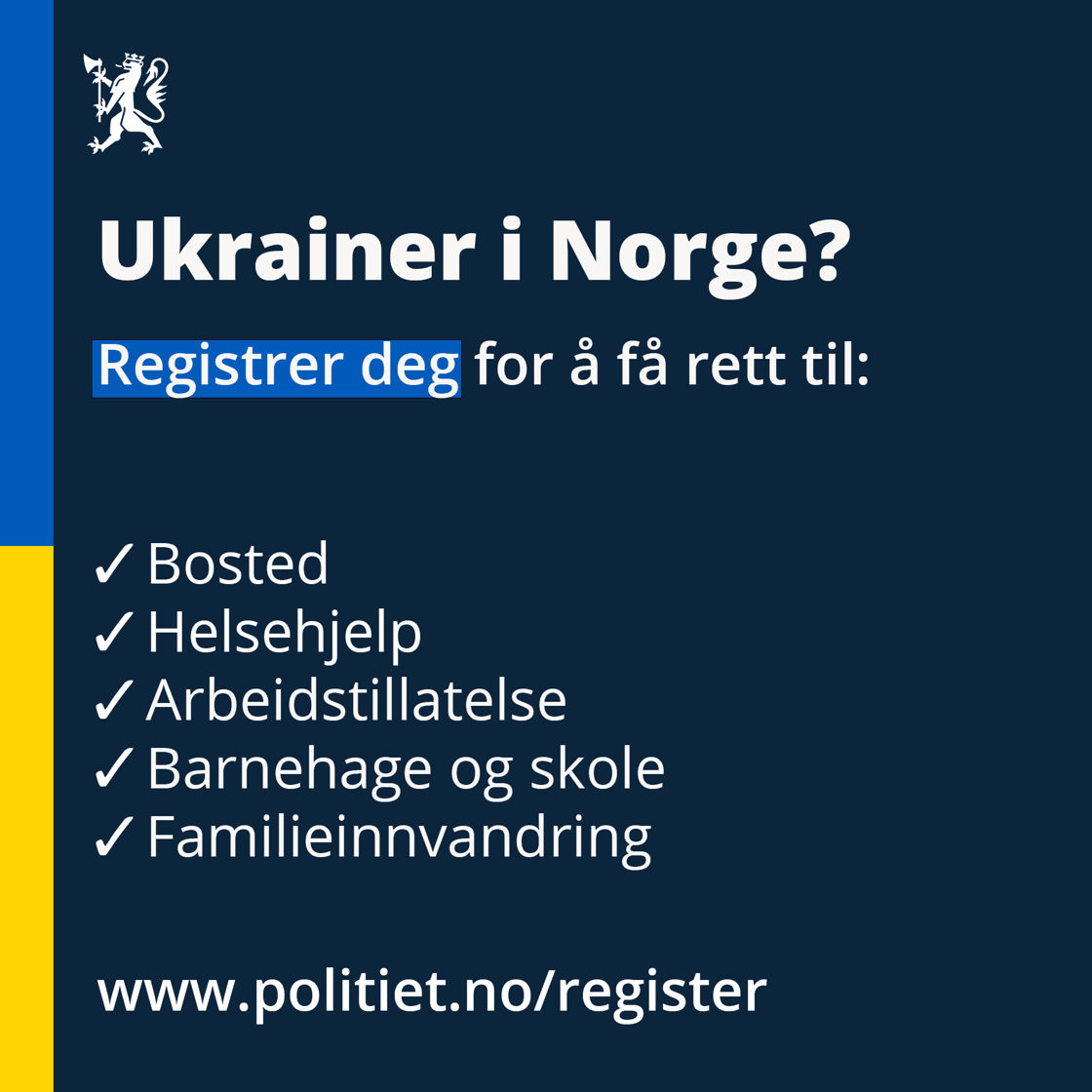 Justis- og beredskapsdepartementet vil nå informere ukrainere i Norge om at de må registrere seg for å få rett til: Bosted, helsehjelp, arbeidstillatelse, barnehage, skole og familieinnvandring.