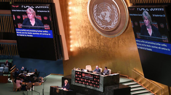 - For å markere at det er 100 år siden Nelson Mandela ble født arrangerte FN et plenumsmøte til ære for ham, dagen før generaldebatten starter i FNs generalforsamling. På vegne av de nordiske landene holdt Norge et fellesinnlegg der statsministeren blant annet la vekt på utfordringene knyttet til fredsbygging og Nelson Mandelas evne til å skape bærekraftig fred gjennom forsoning og inkludering.
