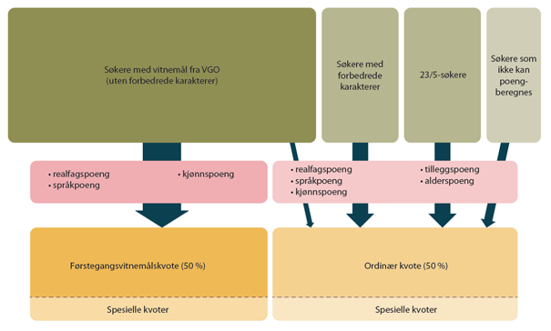 Utvalget foreslår å videreføre dagens ordning med spesielle kvoter for nordnorske søkere og søkere med samisk språkkompetanse. I tillegg til disse foreslår utvalget å erstatte kjønnspoeng med kvoter for kjønn på noen utdanninger. Kvotene skal bidra til at arbeidslivet og enkeltmennesker skal ha tilgang til yrkesutøvere av begge kjønn.