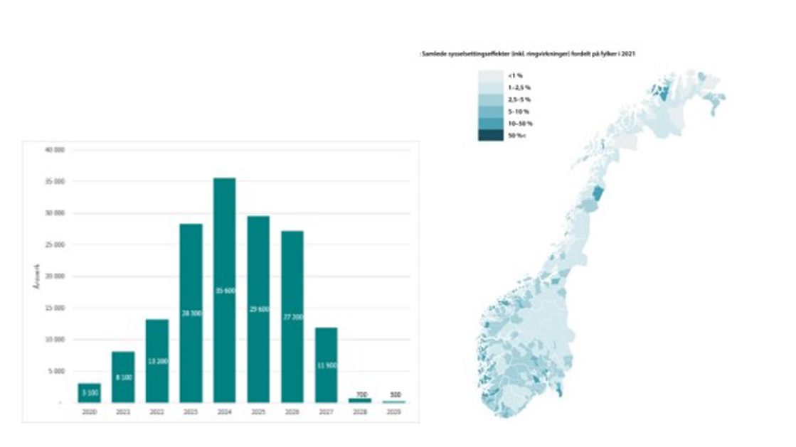 Menon (rapport 10/2023) finner at prosjektene som ble vedtatt i perioden 2020-2022 gir investeringer på om lag 440 milliarder kroner, der om lag 290 milliarder ventes å rette seg mot norske aktører. Investeringene er beregnet å gi grunnlag for et arbeidskraftbehov på om lag 158 000 årsverk i perioden fra 2020 til 2029. Behovet for arbeidskraft er spredt over hele landet, men er sterkest langs kysten.