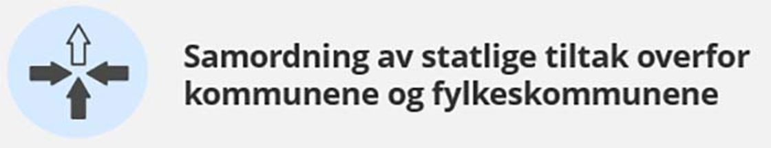 Samordning av statlige tiltak overfor kommunene og fylkeskommunene: Samordningsansvaret innebærer at avdelingen må se oppgavene i kommunesektoren i sammenheng med de økonomiske ressursene sektoren har til rådighet. Avdelingen må vurdere om statlige tiltak overfor kommunesektoren (lover, forskrifter, øremerkede tilskudd, forandringer i fordelingen av oppgaver mellom forskjellige forvaltningsnivåer o.a.) er i overensstemmelse med generelle retningslinjer for arbeidsdelingen mellom forvaltningsnivåene og med prinsippene for statlig styring av kommunesektoren.