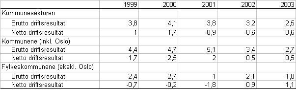 For kommunesektoren som helhet lå netto driftsresultat på et relativt lavt nivå i perioden 1999-2003, om lag 1 prosent av inntektene. Nettodriftsresultat var særlig lavt i 2002 og 2003, noe som har sammenheng med skatteinngang og pensjonskostnader. Svekkelsen av netto driftsresultat ble imidlertid begrenset av at kommuner og fylkeskommuner maktet å holde sysselsettingsveksten nede.