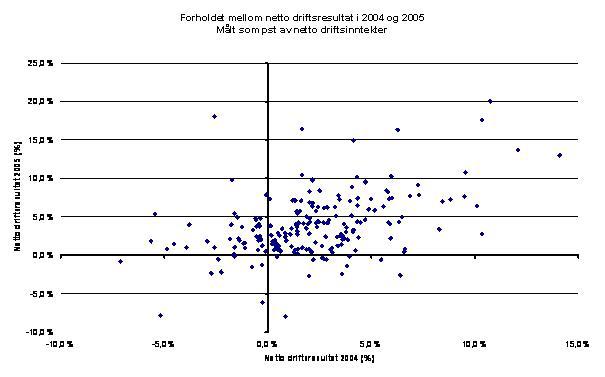 I figur 1 vises forholdet mellom netto driftsresultat i 2004 og 2005. Kommunene som hadde et positivt nettodriftsresultat i 2004 hadde også i hovedsak et positivt resultat i 2005. Kommuner med et negativt resultat i 2004 kom i stor grad ut med et positivt resultat i 2005. Av KS sin regnskapsundersøkelse framkommer det at hele 80 prosent av kommunene som hadde negativt netto driftsresultat i 2004 kom ut med positivt netto driftsresultat i 2005. Kun et fåtalls kommuner kommer ut med et negativt resultat begge årene. Dette tyder på at de fleste kommuner med svake netto driftsresultater i 2004 har lagt vekt på å styrke den økonomiske balansen. Mange kommuner med høye netto driftsresultater i 2004 har også høye netto driftsresultat i 2005.