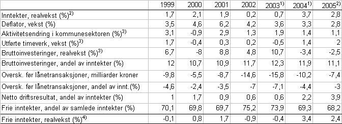 I tabell 2 presenteres en del indikatorer som gir uttrykk for utviklingen i inntekter, aktivitet og underskudd i kommunesektoren i perioden 1999-2005. Tallene er basert på utvalgets rapport fra desember 2005, samt foreløpige tall for kommuneforvaltningens inntekter og utgifter som Statistisk sentralbyrå publiserte 17. februar 2006. I tillegg publiserte Statistisk sentralbyrå 6. desember 2005 reviderte tall for kommuneforvaltningens inntekter og utgifter i 2003 og 2004, som ikke var innarbeidet i desemberrapporten.