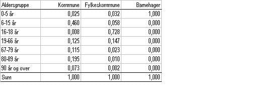Barnehager er en viktig sektor for kommunene, og hvor befolkningens alderssammensetning har stor betydning. Siden barnehagene ikke omfattes av kostnadsnøkkelen i inntektssystemet, er det konstruert en egen kostnadsnøkkel for denne sektoren, hvor 100 prosent av utgiftene er knyttet til aldersgruppa 0-5 år.
