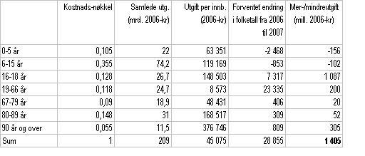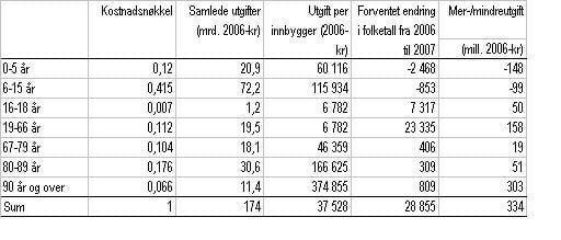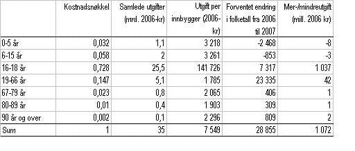 Tabell 4 viser driftsutgiftene knyttet til de ulike aldersgruppene totalt og per innbygger. Mer- eller mindreutgift knyttet til de enkelte aldersgruppene framkommer som produktet av beregnet utgift per innbygger og forventet endring i befolkningstallet. De forenklede kostnadsnøklene for kommuner, fylkeskommuner og barnehager i tabell 2 er vektet sammen til én felles kostnadsnøkkel. Andelen som driftsutgiftene til de enkelte sektorene utgjør er benyttet som vekter (jf. tabell 3).