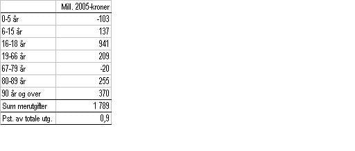 Mindreutgiftene for aldersgruppene som har nedgang i folketallet (dvs. gruppene 0-5 år og 6-15 år) summerer seg til vel 250 mill. kroner. Merutgiftene for de øvrige aldersgruppene som har økning i folketallet summerer seg til vel 1 650 mill. kroner.