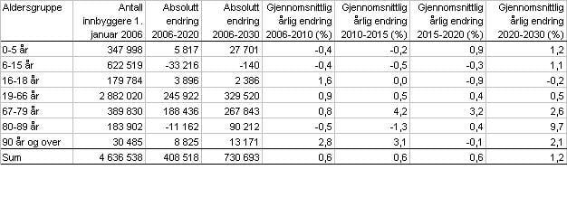 Tabell 6 viser forventet vekst i antall innbyggere fram til 2030. Det framgår at befolkningen som helhet antas å øke med om lag 730 000 fra 2006 til 2030. Dette tilsvarer en vekst på 16 prosent.