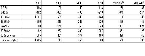 I tabell 7 vises anslåtte mer- og mindreutgifter i perioden 2007-2030. Usikkerheten ved beregningene må understrekes. Når man beregner utgiftskonsekvenser på flere års sikt, er det viktig å minne om de forutsetninger som det er redegjort for innledningsvis i pkt. 3. Eksempelvis vil forutsetningene om uendret ressursinnsats per bruker og konstant dekningsgrad og produktivitet være mer usikre i et lengre tidsperspektiv. Det vil også være større usikkerhet knyttet til befolkningsframskrivingene. Særlig vil det gjelde for de yngste aldersgruppene.