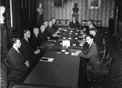 Fra september 1940 til februar 1942 ble Statsrådsalen brukt av statsrådene som ble oppnevnt av den tyske okkupasjonsmakten 25. september 1940. På bildet fra 26. september 1940 er interiøret uendret fra 1933. Sofaene i bakgrunnen synes bedre, de nærmeste stolene ser ut til å være blant dem som i dag er i bruk på møterom 5. (Foto: Riksarkivet).