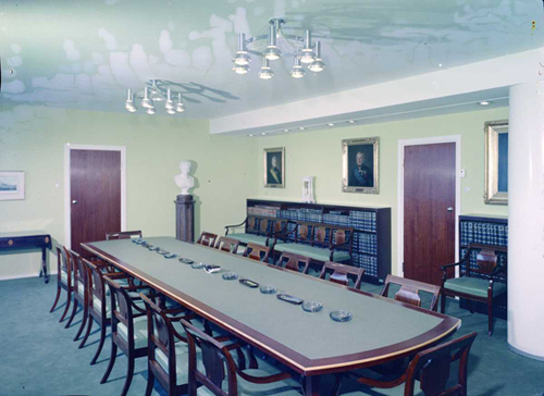 Gammelt og nytt empiremøblement på statsministerens møterom i 15. etasje i Høyblokken i februar 1959, få måneder etter innflyttingen 26. november 1958. Statsrådsekretariatets malerier og byster er også med, det samme gjelder alabasturet på bokreolen. (Foto: Leif Ørnelund/Oslo Museum).