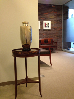 Møblementet som ble tatt med til Høyblokken i 1958, ble sammen med nytt bord og nye stoler i samme stil (tegnet av Alf Sture og utført ved Hiorth og Østlyngens verksteder) plassert på statsministerens møterom (møterom 1) som da lå i 15. etasje, nord for resepsjonen og på østsiden av korridoren.