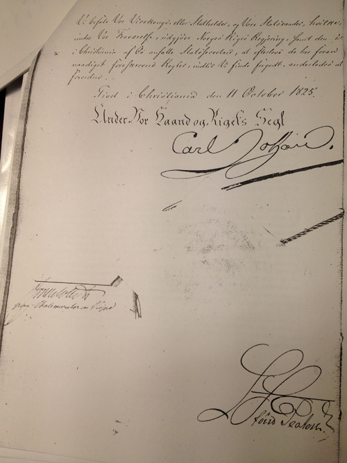 Første og siste side av Carl XIV Johans "Kongeligt Rescript inneholdende Instruction for den i Norge under Kongens Fraværelse indsatte Regjering" gitt i Christiania 11. oktober 1825. Kontrasignaturen tilhører trolig kongens stattholder Johan August Sandels. Nede til høyre har statssekretær Ludvig Stoud Platou parafert dokumentet. (Foto: Statsministerens kontor).