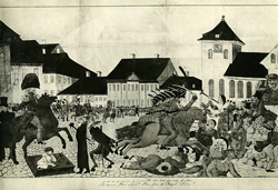 Samtidig tegning av "Torgslaget" i Christiania 17. mai 1829, der norske kavalerister driver demonstrantene bort. (Foto: Trondheim Byarkiv).