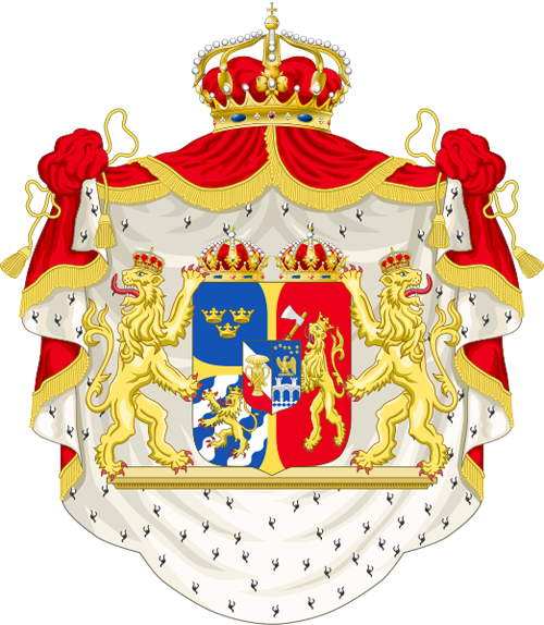 Sveriges og Norges felles kongevåpen i unionstiden 1814-1905, med det norske riksvåpenet (løven med olavsøksen) på sekundærplassen til høyre i det dobbeltkronede skjoldet. (Foto: Wikipedia).