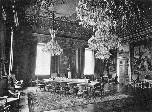 Den nåværende Konseljsalen - Statsrådsalen - på Stockholms slott har vært i bruk siden 1870-årene. Her fotografert tidlig på 1900-tallet. (Foto: Wikipedia).