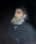 En mer resignert Sverdrup etter fire av sine fem år som statsminister, malt av Hans Heyerdahl i 1888. Lorgnetten henger passivt fra brystlommen.