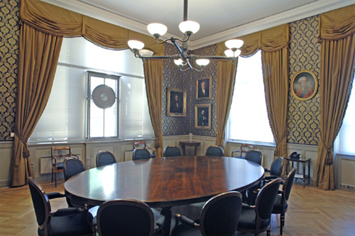 Kollegierommet i Universitetets Domus Academica i Oslo sentrum etter restaurering i 2007, også omtalt som universitetssekretærens "stue". Her møttes kollegiet, med Christian Holst som sekretær 1852-1878. I vinduet til venstre, mot Karl Johans gate, henger uret som siden 1853 har gjort at bygningen også kalles Urbygningen. (Foto: Wikipedia).