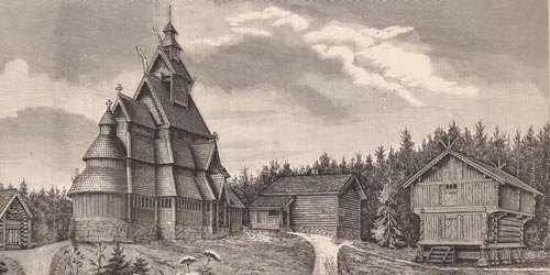 Gol stavkirke og noen av de andre husene i Oscar IIs samling på Bygdøy kongsgård. (Xylografi: Norsk Folkemuseum).