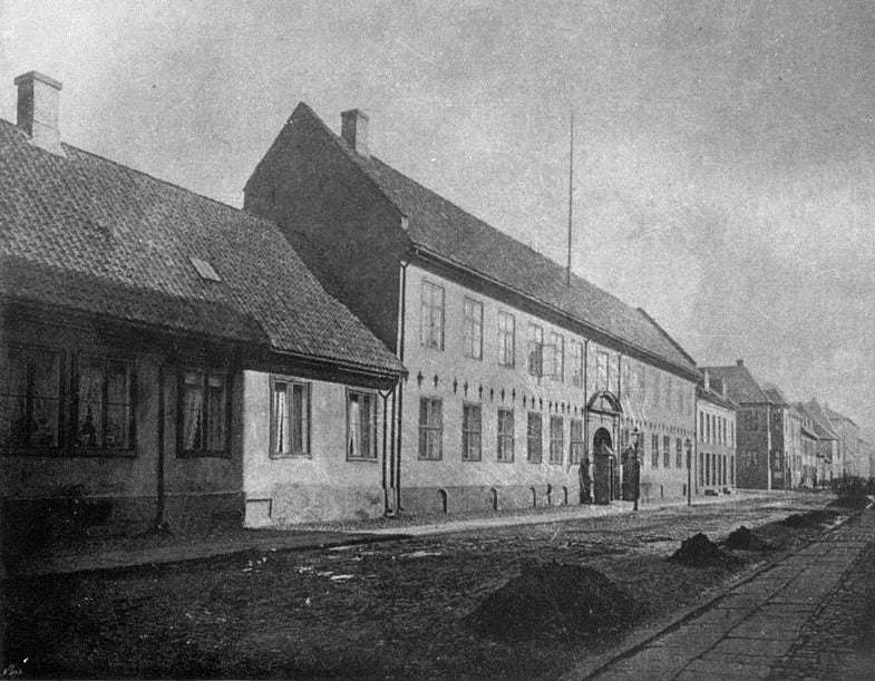 Statsrådsalen ligger bak de fire nærmeste vinduene i 1. etasje, forværelset bak de to vinduene bortenfor, nærmest porten. (Foto: S.B. Mejdell/Oslo Museum).