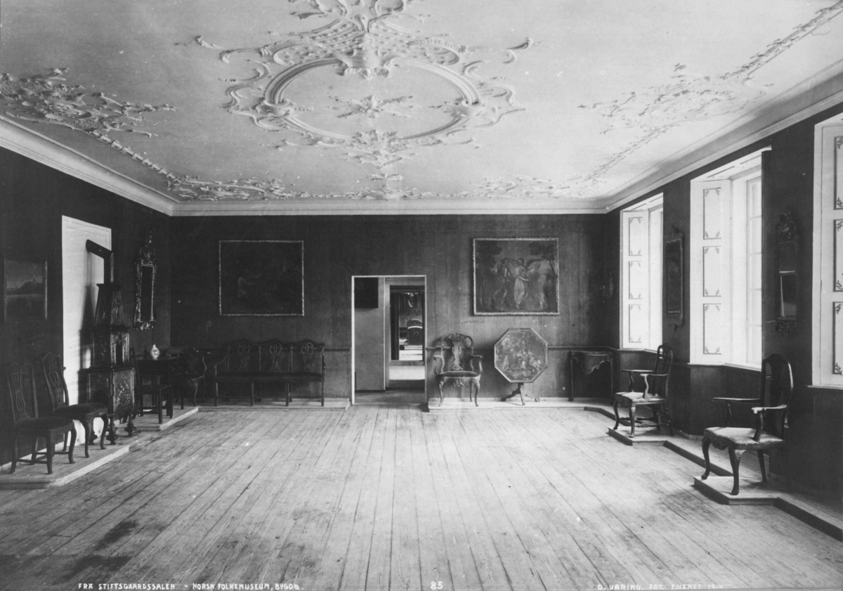 Statsrådsalen i Stiftsgården fotografert etter at den ble flyttet til Norsk Folkemuseum i 1913. Endeveggen mot øst har nå fått åpning mot andre værelser i Folkemuseets bygning. (Foto 1914: Olaf Væring/Norsk Folkemuseum).