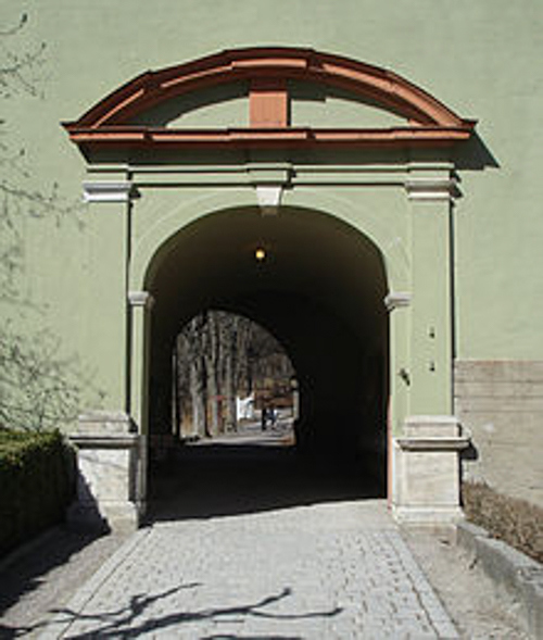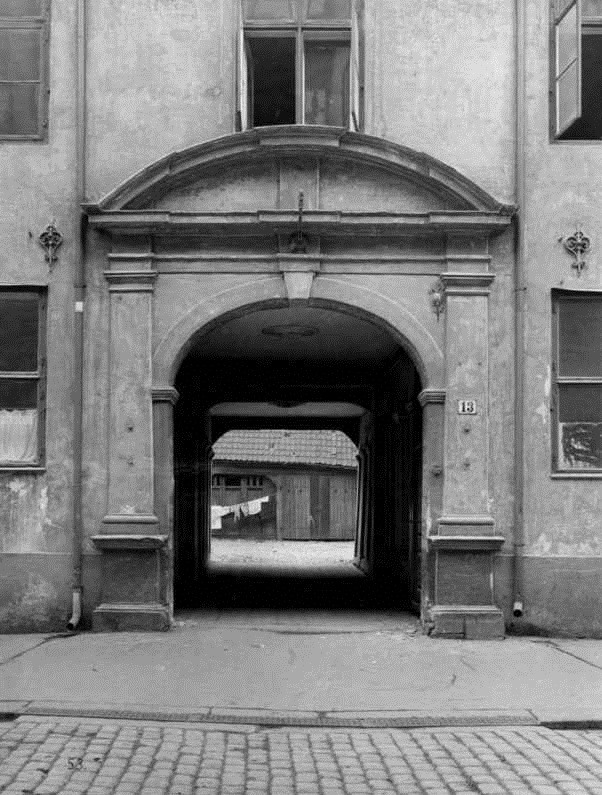 Øverst Stiftsgårdens hovedportal mot Rådhusgaten i 1900, fire år etter at statsministeren flyttet til Parkveien 45. (Foto: Olaf Væring/Norsk Folkemuseum). Nederst samme portal i Bybygningens fasade mot Torget på Norsk Folkemuseum på Bygdøy i Oslo, dit portalen ble flyttet da Stiftsgården ble revet i 1913. (Foto: Wikipedia).